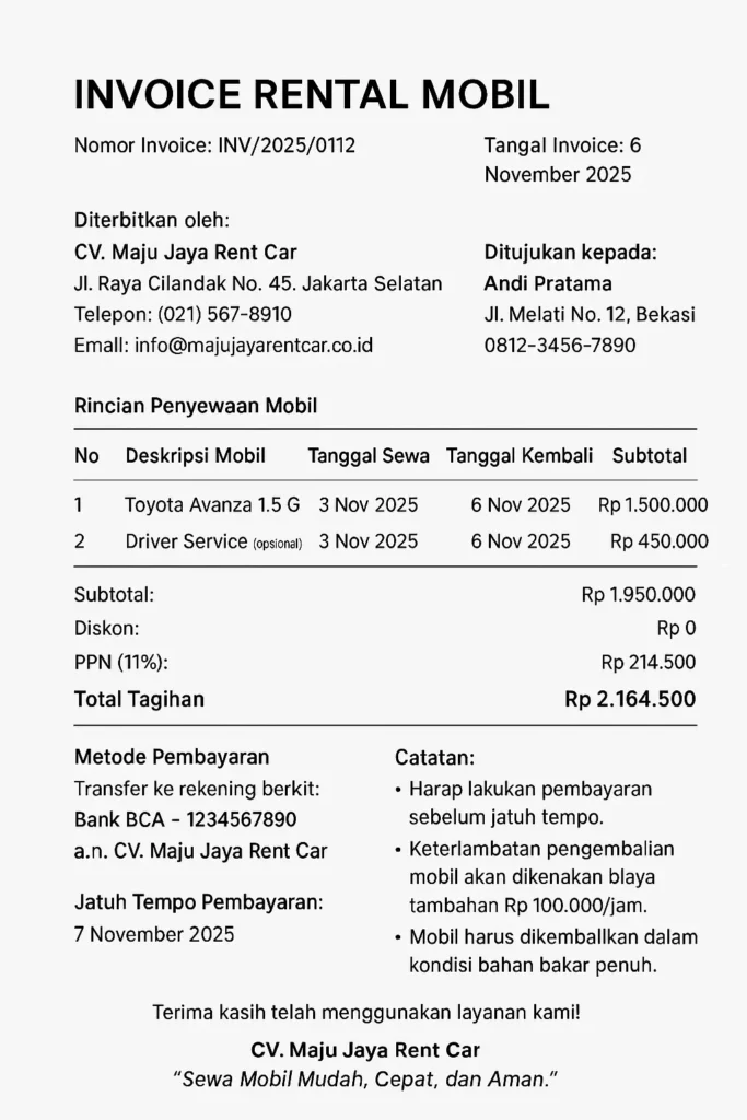 Invoice memastikan setiap penyewaan mobil terdokumentasi secara legal. - Dokumen Hukum