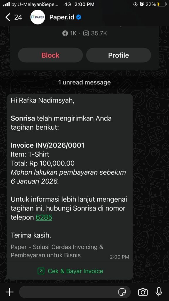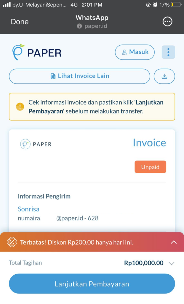 1. Klik menu Lihat dan Bayar Invoice dari media pengirim invoice (WhatsApp, Email, atau SMS)