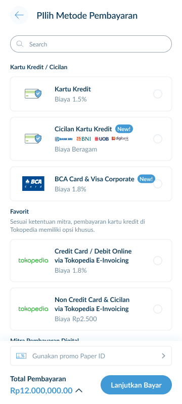 Dengan berbagai pilihan metode pembayaran, Paper OrderHub memungkinkan Anda untuk melakukan transaksi lebih cepat dan fleksibel, termasuk opsi pembayaran menggunakan kartu kredit dan cicilan.